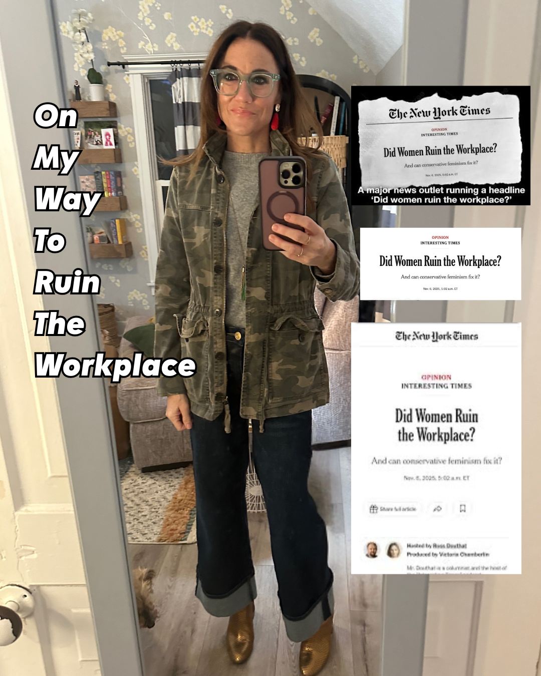 A mirror selfie of Kim that says, "On my way to ruin the workplace." Next to it are screenshots of the headlines from the New York Times saying, "Did women ruin the workplace?"